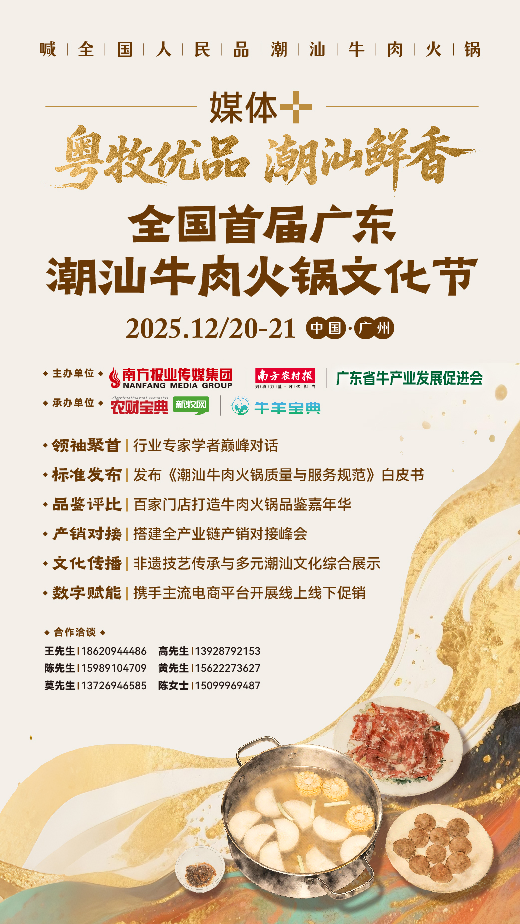 2025年12月,以“粤牧优品,潮汕鲜香——喊全国人民品潮汕牛肉火锅”为核心主题的全国首届广东潮汕牛肉火锅文化节,将在广州热力启幕。这场由南方报业传媒集团、南方农村报社、广东省牛产业发展促进会联合主办的盛会,立足潮汕牛肉火锅的产业特色与文化底蕴,旨在联合广东省内头部牛肉火锅品牌企业,深度打通牛肉养殖、屠宰加工、餐饮服务全产业链,汇聚各方资源、直面产业挑战,为行业高质量发展注入新动能,也将让更多消费者爱上贵州小黄牛,助力其“卖爆”市场。