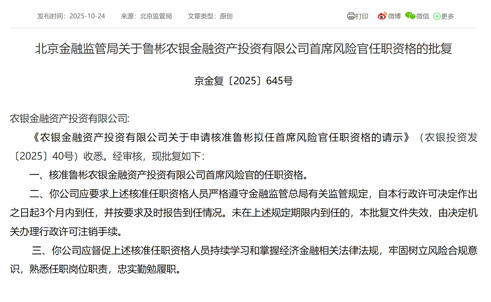 10月24日,北京金融监管局发布关于鲁彬农银金融资产投资有限公司首席风险官任职资格的批复信捷策路,核准鲁彬农银金融资产投资有限公司首席风险官的任职资格。