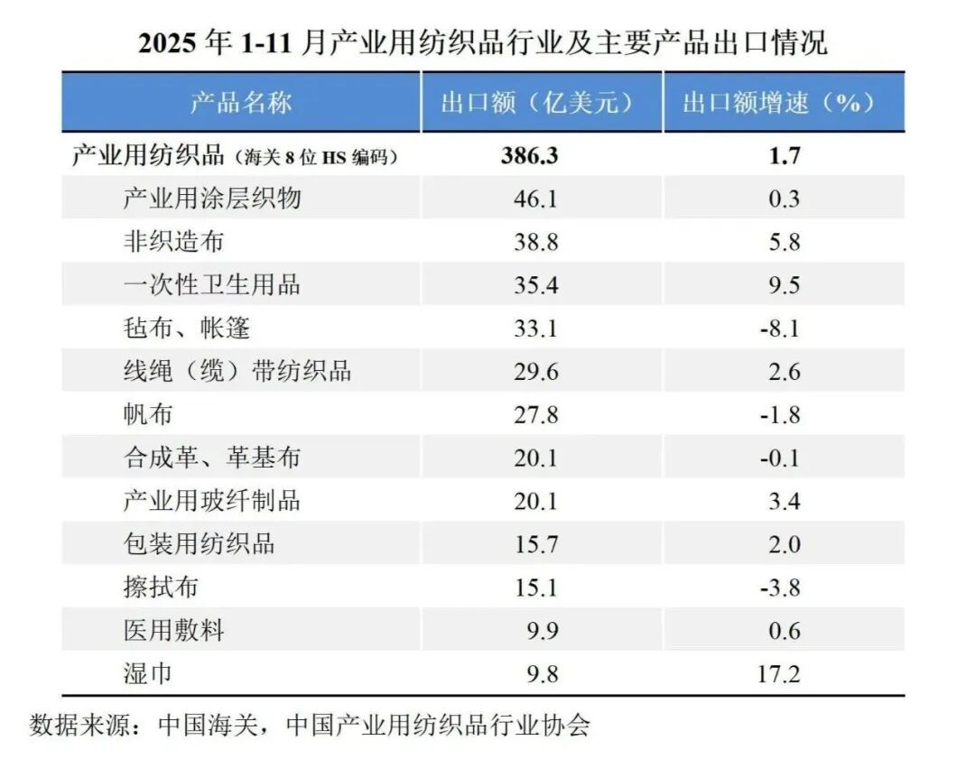 根据中国海关数据(海关8位HS编码统计数据),2025年1-11月我国产业用纺织品行业的出口额为386.3亿美元,同比增长1.7%/图源:@中国产品用纺织品行业协会